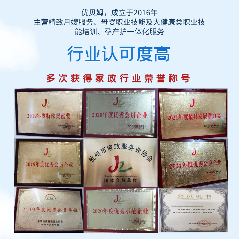 杭州優(yōu)貝姆健康管理有限公司,成立于2016年,是一家致力于打造集定制居家月嫂服務(wù)、孕產(chǎn)護一體化服務(wù)、母嬰健康管理培訓(xùn)學(xué)校為一體的現(xiàn)代化母嬰健康管理企業(yè)。 連續(xù)多年被浙江省家政協(xié)會及杭州市家政協(xié)會評為:“優(yōu)秀會員單位”“家政示范企業(yè)”“特殊貢獻獎”等殊榮。 多次在浙江省家政技能比賽中獲得優(yōu)異成績,并代表浙江省參加“長三角家政技能大賽”并取得優(yōu)異成績。